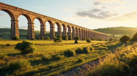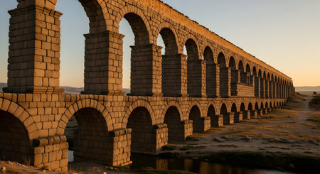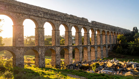 Bathed in the warm glow of a setting sun, a magnificent ancient Roman aqueduct stands as a testament to engineering prowess and timeless beauty.