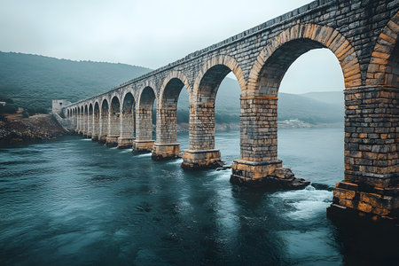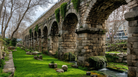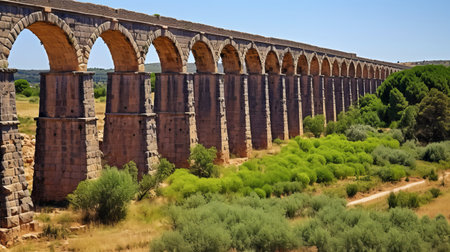 Roman aqueduct's network of stone channels and arches water in scenic countryside