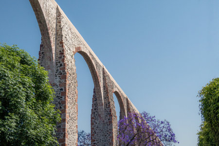 A Queretaro Mexico aqueduct with jacaranda tree and purple flowers