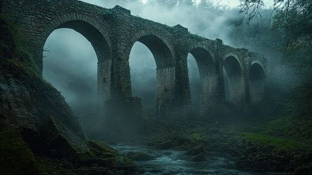 photo of fog rolling over a medieval stone bridge, the arches barely visible through the mist, soft diffused lighting casting subtle shadows on the wet stone, atmospheric and mysterious, professional photo, photorealistic --chaos 10 --ar 16:9 --v 6.1 Job ID: 08e1cc8f-ff5d-416a-86ba-fd9359b3353b