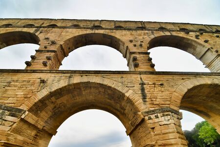 The last rays of a vibrant sunset illuminate the ancient arches of the Pont du Gard, a masterpiece of Roman engineering. The warm, golden light casts a timeless glow on the historic stone, inviting reflection on centuries of history and enduring beauty in the French countryside.