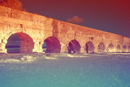 Aqueduct in ancient city Caesarea at sunset. Creative color
