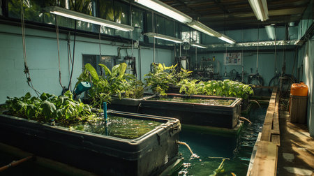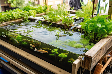 close-up of aquaponics system, showing fish swimming and plants growing, created with generative ai