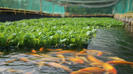 This vivid image showcases a modern aquaponics system featuring lush green plants thriving in water alongside colorful koi fish. The setup highlights sustainable agriculture practices that combine fish farming and plant growth, promoting environmental harmony.