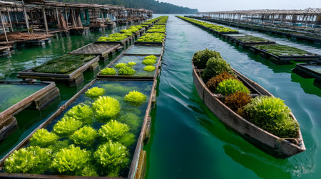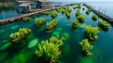 Floating green algae farms in tranquil water and bamboo structures in a natural setting.