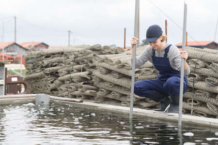 A worker checks the growth of fish on a trout farm. A trout breeding and rearing farm.