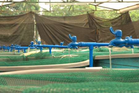 Aerial top down view over a fish farm with lots of fish enclosures on cages. fish farm aquaculture and industry