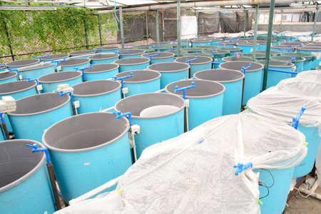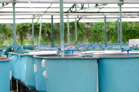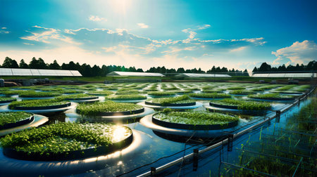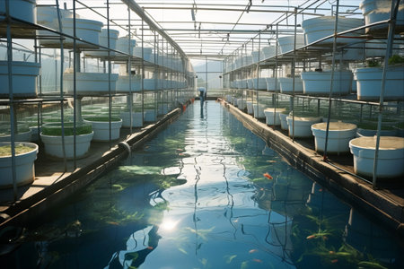 An Aquaculture Farm modern aquaculture farm with rows of fish tanks or ponds, surrounded by lush greenery.