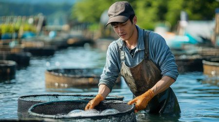 A worker collects seafood from a large net in an aquaculture farm surrounded by tranquil waters and lush greenery, highlighting the importance of sustainable fishing practices.