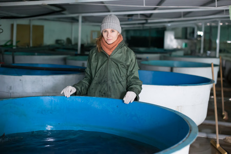 Young woman in waterproof clothing standing near fish tank on sturgeon fish farm
