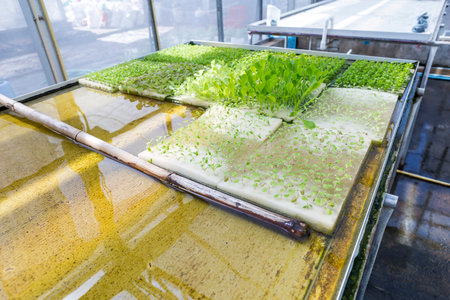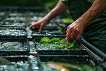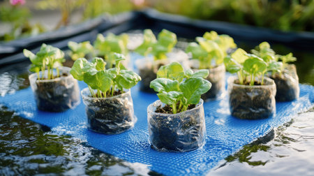 Water plants thriving in clear plastic trays floated over calm water surface. Bright green leaves reflect sustainability themes. Concept of gardening, eco-friendly practices, aquaculture.