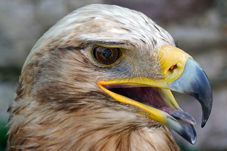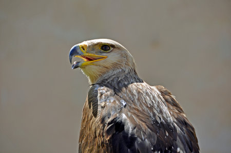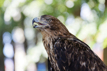A portrait of an White-tailed Eagle at falconer shows at ELRO's folk craft fair in Kiemark, Slovakia: eagle turned his head, opened the beak and looks at the lens.