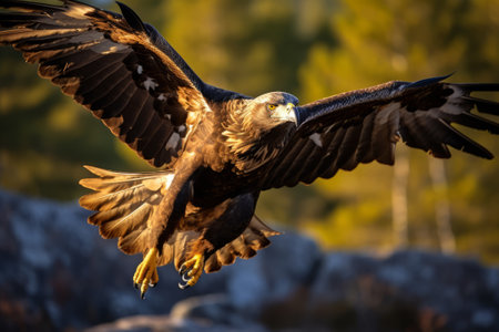 Golden eagle soaring with outstretched wings over a rocky forest landscape