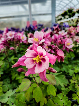Close-up of a pink Columbine flower in a greenhouse