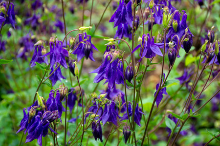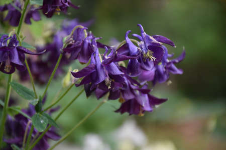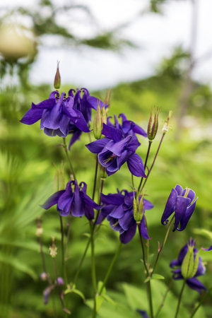 Garden with very pretty dark purple columbine flowers blooming.