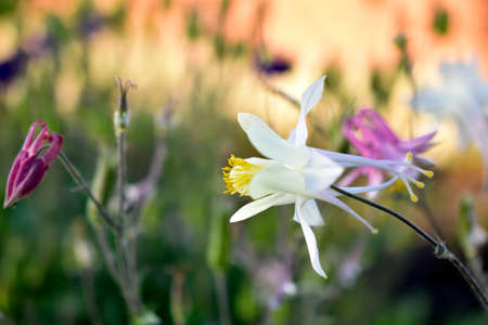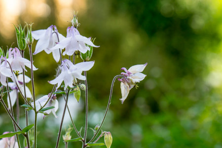 Pretty blooming white columbine or aquilegia flowers in summer season.