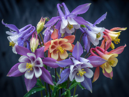 A vibrant bouquet of columbine flowers showcases a spectrum of colors, with delicate water droplets clinging to their petals, enhancing their natural beauty and charm.