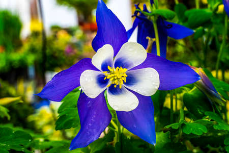 Blue White Columbine Blossom Blooming Macro. Native to North America.