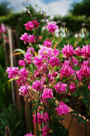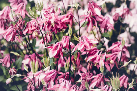 Summer background with blooming pink aquilegia flowers. Beautiful nature scene. Moody bold colors.