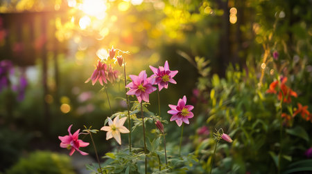 Beautiful blooming flowers in a vibrant garden during sunset, showcasing natures colors and serenity