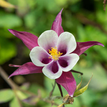 Close up of a purple and white aquilegia flower in bloom