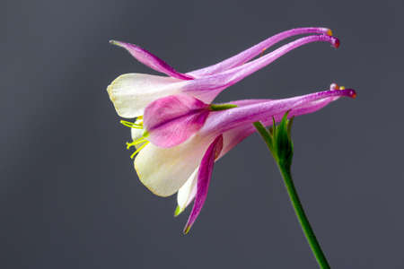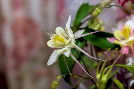 Flower Aquilegia. Blooming flower with white pink petals, yellow stamens on green stem, drops of dew in summer spring. Flowering plant. Spring summer Background