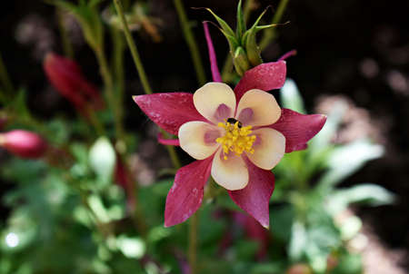 Crimson Star Columbine flower blossoms in a garden