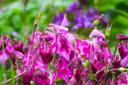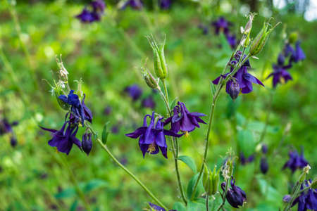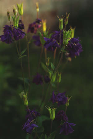 Purple flowers of Aquilegia, a catchment in the garden in summer. Selective focus.