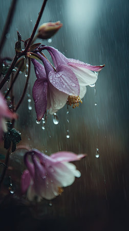 Soft rain falling gently on Columbine, with water droplets forming and slowly dripping. The background is softly blurred with natural, moody atmosphere.
