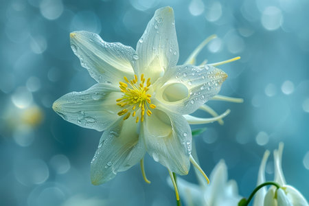 Elegant Water Droplets Adorning a Delicate White Flower Against a Soft Blue Bokeh Background AI Generative