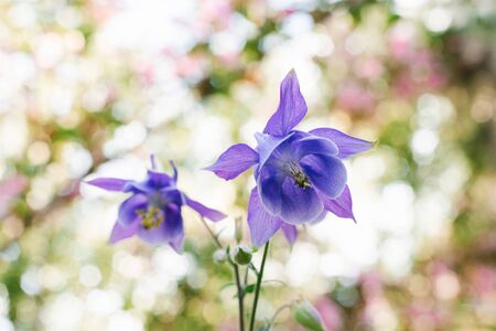 Purple flowers aquilegia backlit on a sunny summer day, macro. Selective focus