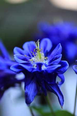 Beautiful meadow field with clssic blue flowers aquilegia. Spring or summer wildflowers closeup. Health care concept. Alternative medicine. Color of the year 2020 classic blue