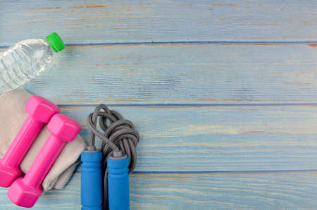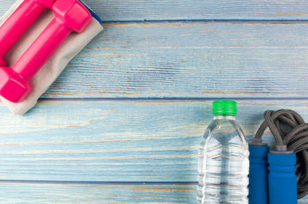Flat lay style sport concept. Dumbbells, jump rope, bottle of water with a towel. Sports equipment on blue wooden background. Top view