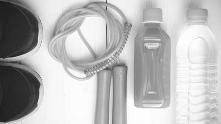 fitness equipment : running shoes,jumping rope and water bottle on white wood table black and white color tone style