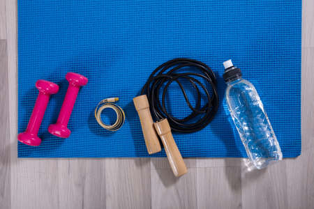 Elevated View Of Fitness Equipments On Blue Exercise Mat