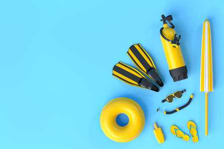 Colorful scuba stuff and beach accessories like umbrella, flip flops and inflatable ring on blue background. 3D render of summer vacation concept and holidays