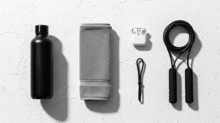 fitness equipment : running shoes,towel,jumping rope,water bottle,phone and measuring tape on white wood table black and white color tone style