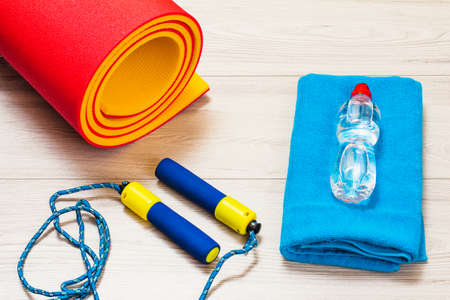 Yoga mat and skipping rop for fitness, a towel, a bottle of water in a room or a gym on the gray floor.