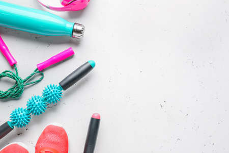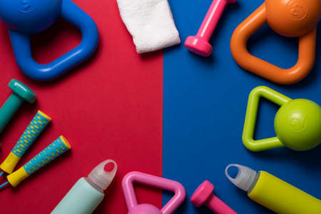 Flat lay composition sports and fitness accessories on colorful background. Ready for training. top view
