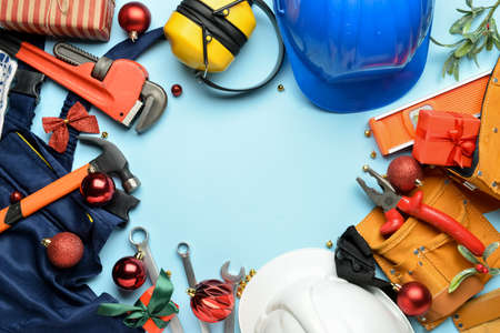 Frame made of construction tools and Christmas decor on color background