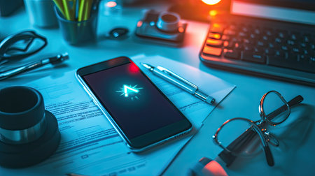 A smartphone vibrating on a work desk with a glowing emergency alert displayed, surrounded by office supplies and papers.