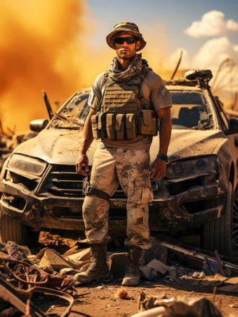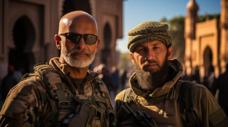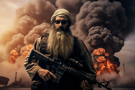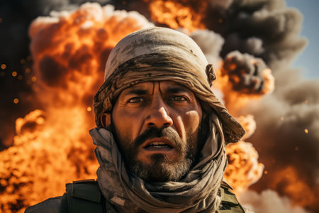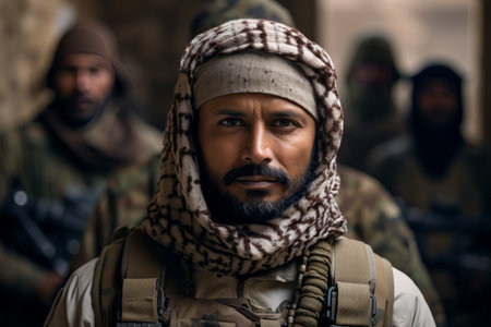 An Arabic soldier, exuded a sense of pride and determination. Clad in traditional attire, his face displayed the rich history and unyielding spirit of his people. A powerful portrait capturing the strength and cultural heritage of a devoted defender of his land. Generative AI