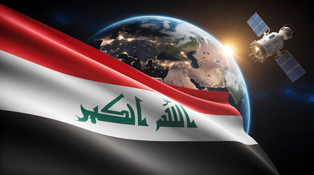 Iraqi flag waving in front of the earth with a satellite in the background