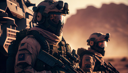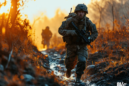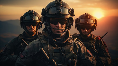 Group of soldiers in full gear on military mission at sunset.