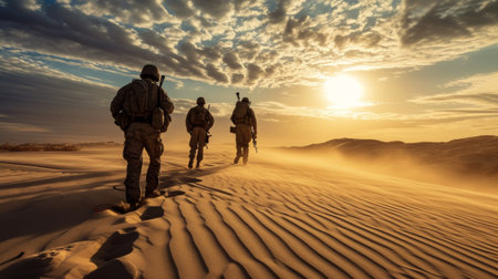 Soldiers walking in the desert at sunset. Military, army and war concept