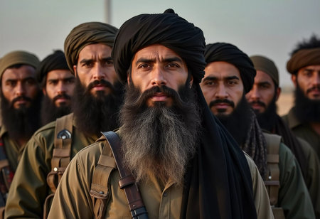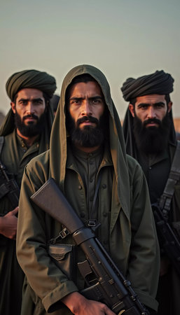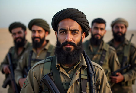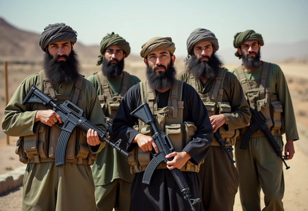 A group of armed men dressed in traditional clothing stand united, showing their camaraderie and readiness. Militant Muslim men, similar to the Taliban or Pakistani army. Thick beard. Generative AI.