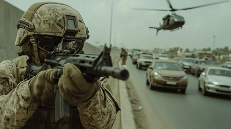 Soldier aiming a rifle during an operation in an urban area with a helicopter flying overhead