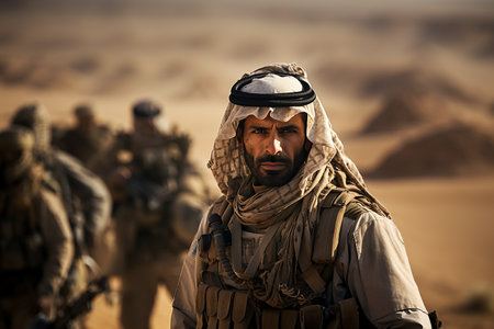 Professional Arabic Soldier in Modern Military Attire, Ready for Action in Desert. Middle East War