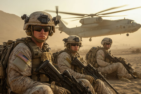 Military personnel equipped with tactical gear sit in a desert landscape while a helicopter hovers in the background, illustrating a moment of preparation and focus during their mission.