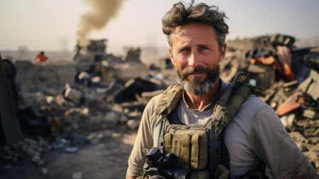 Experienced war reporter camera conflict debris natural light